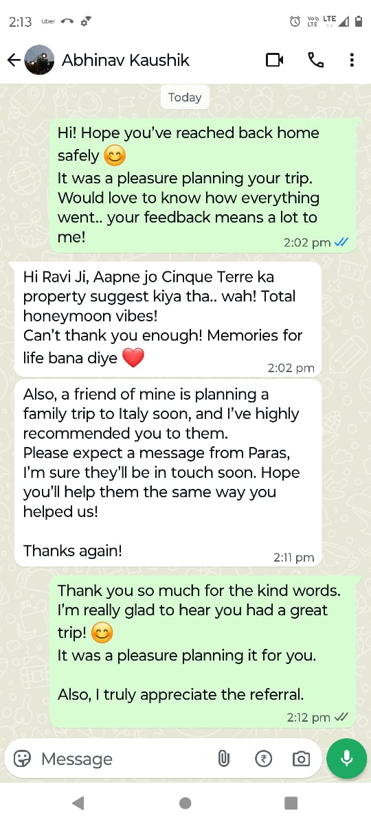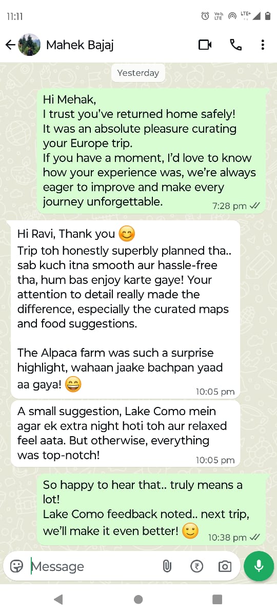 Every journey we design is personal — crafted with care, precision, and a deep understanding of what luxury means to you. The smiles, stories, and heartfelt messages we receive from our travelers are our greatest reward. Here’s what some of them shared after returning from their unforgettable tours.